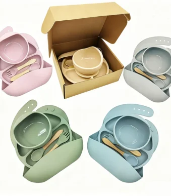 Custom 100% BPA-Free Silicone Suction Bowls Plates Bib Cutlery Spoon Set Kids Baby Feeding Set