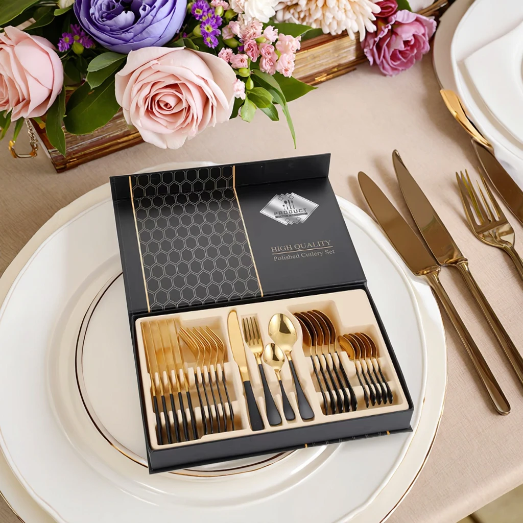24-Piece Cutlery Set Stainless Steel Modern Design for Wedding Knife Fork Spoon Teaspoon Western Tableware Set Gift Box